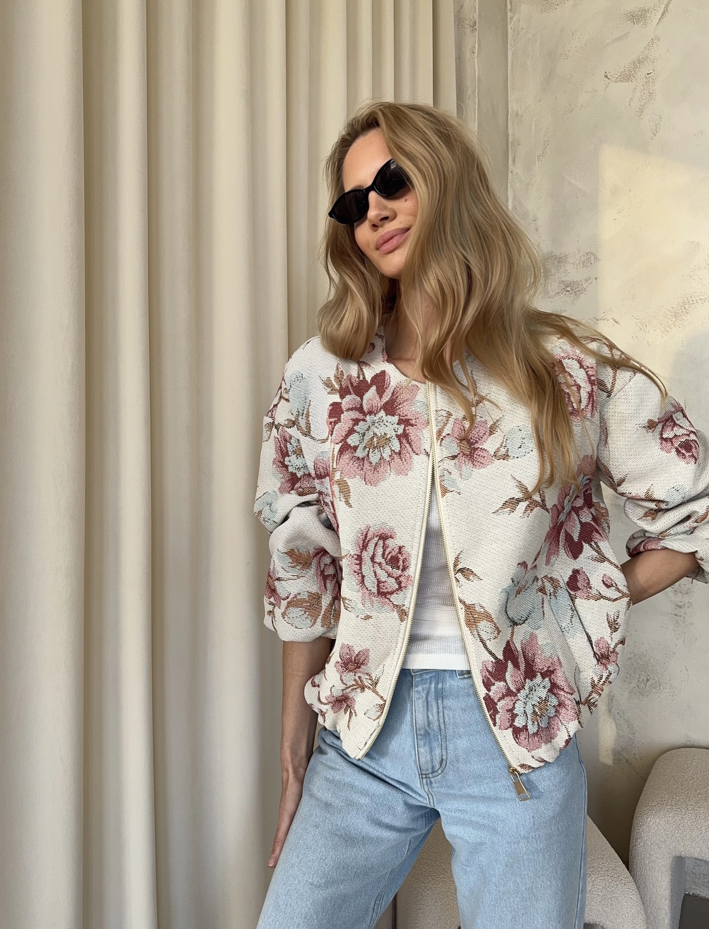 Bomberka z wzorem kwiatów, zapinana na suwak, na podszewce.