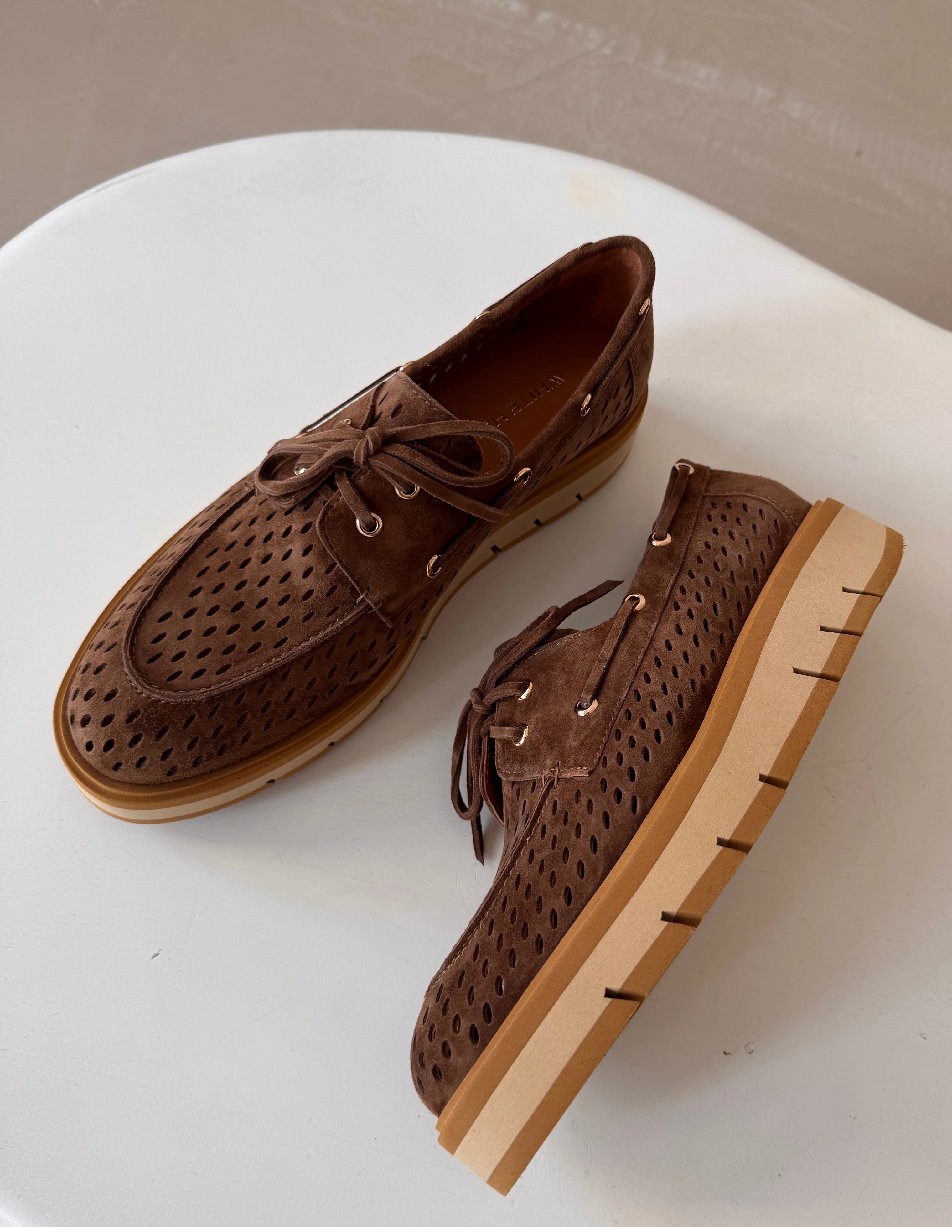Skórzane buty z ażurowej zamszowej skóry na grubej platformie, kolor brązowy.