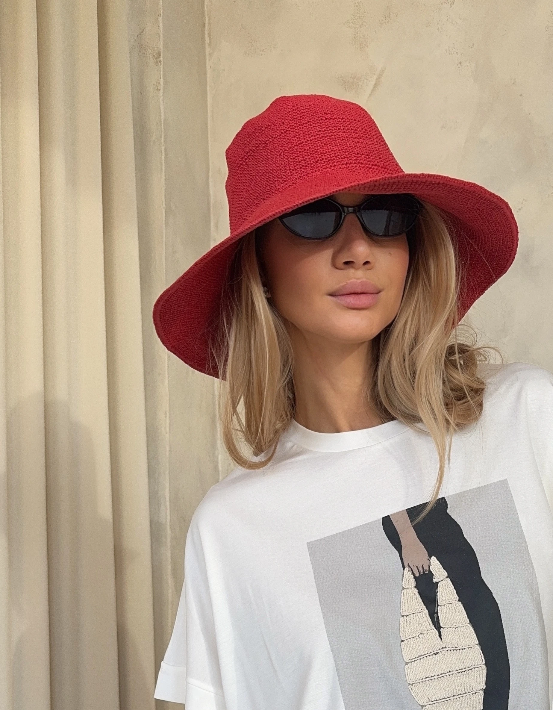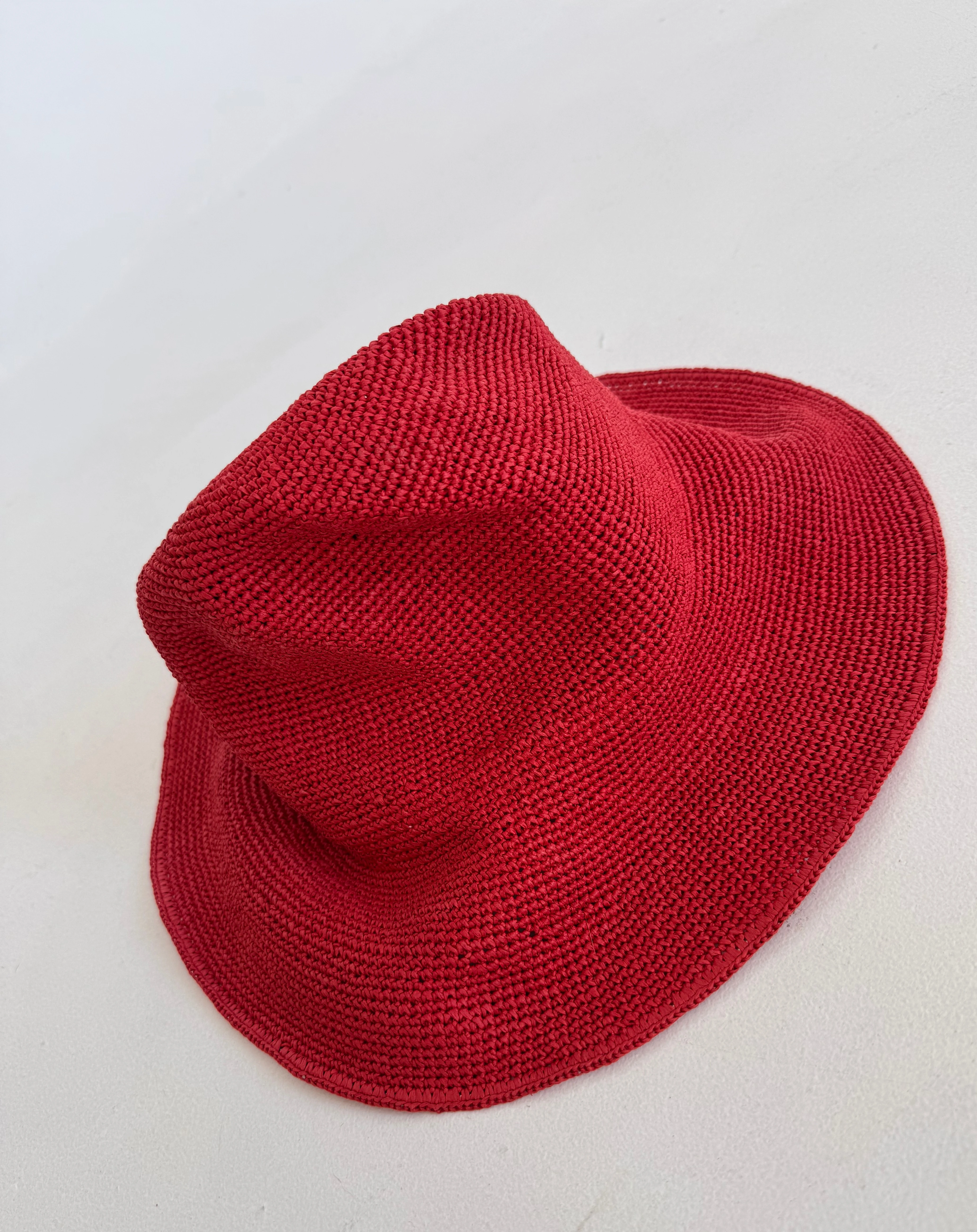 Kapelusz słomkowym w kolorze zgaszonej czerwieni.