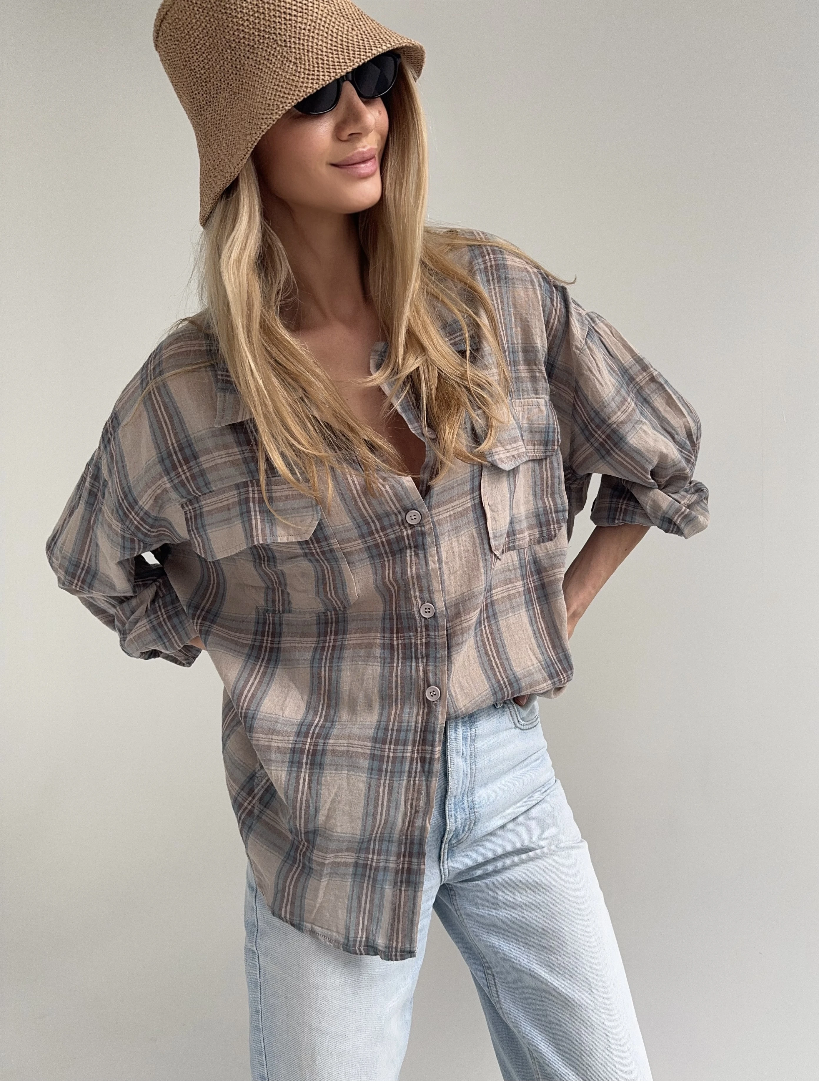 Koszula o luźnym kroju w beżowo- niebieską kratę .