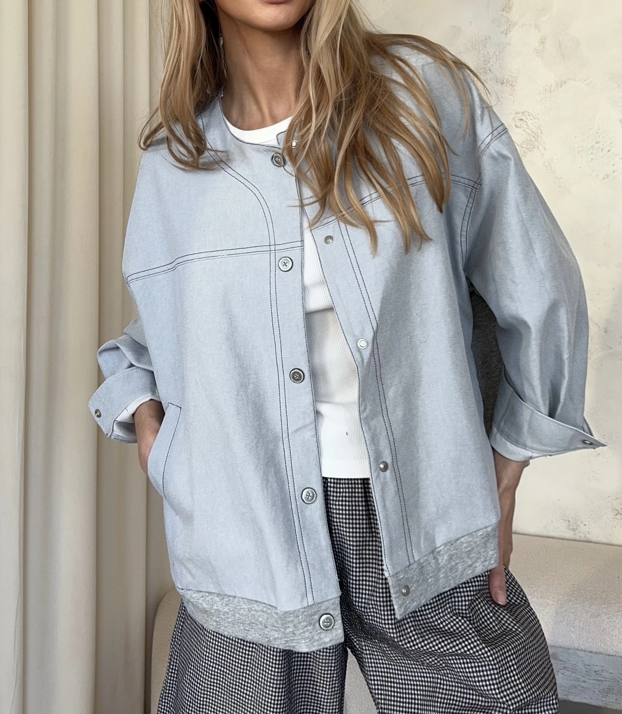 Kurtka zapinana na zatrzaski z kontrastową dresową tkaniną na plecach .