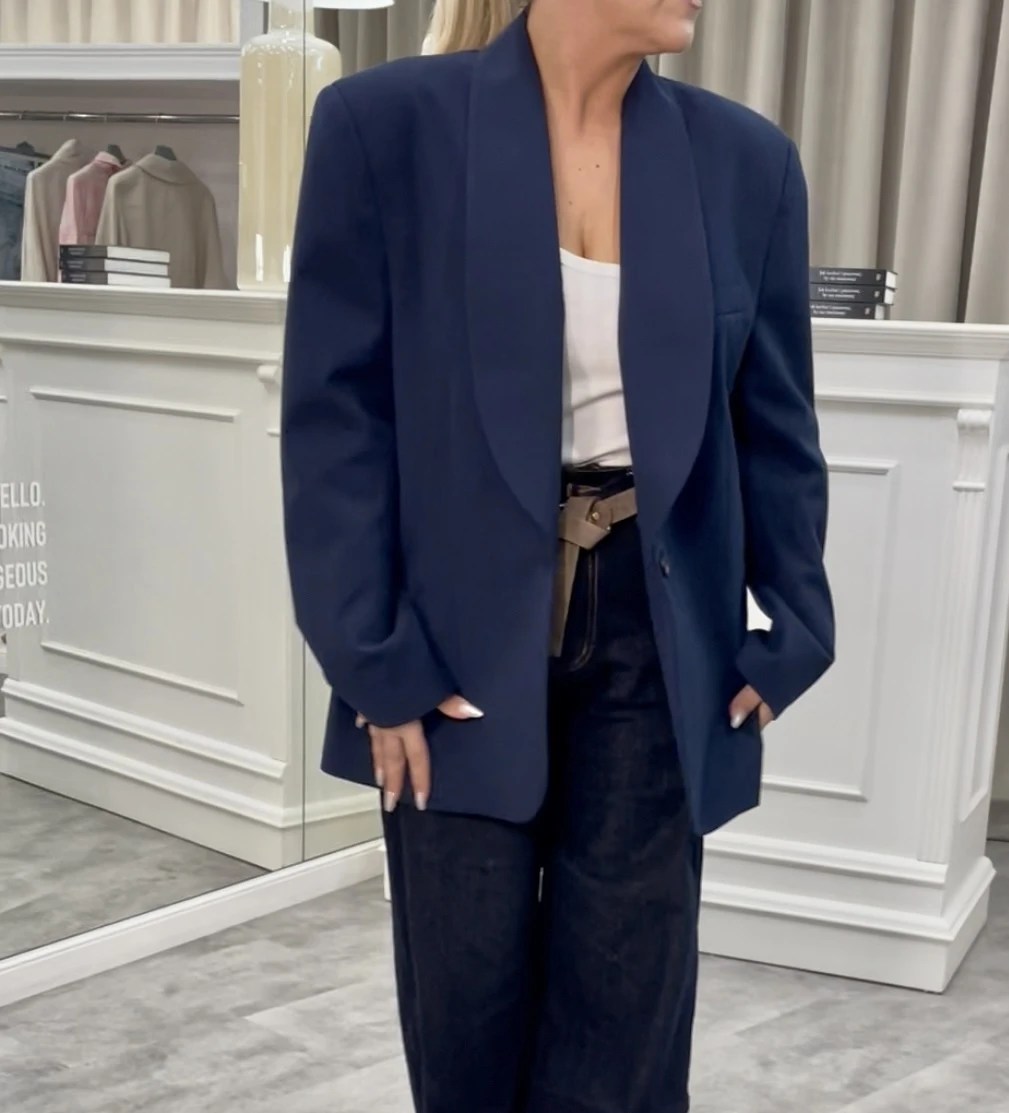 Marynarka w kolorze granatu ze smokingowymi klapami, zapinana na jeden guzik.