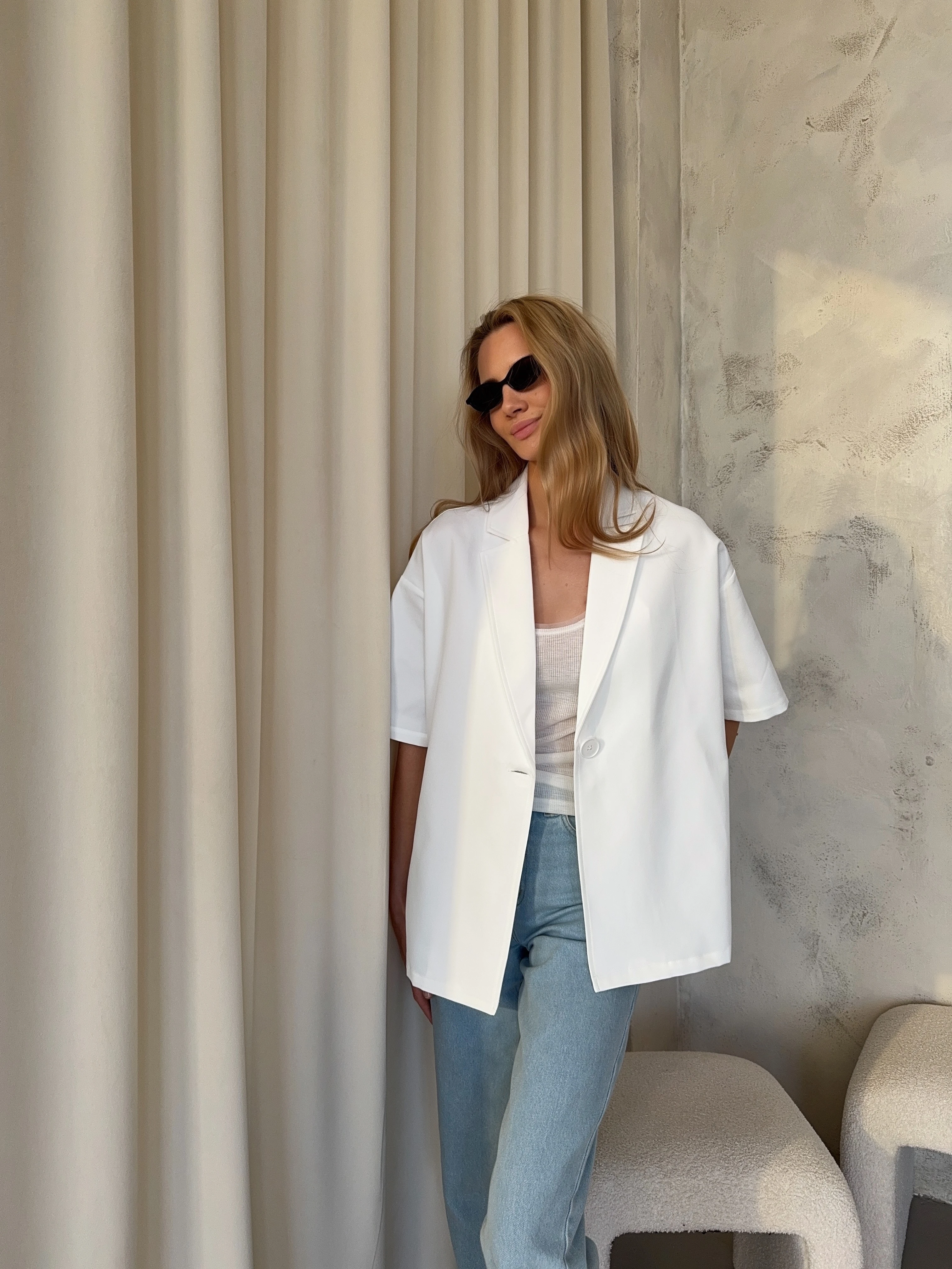 Biała marynarka bez podszewki z krótkim rękawem . Zapinana na jeden guzik.