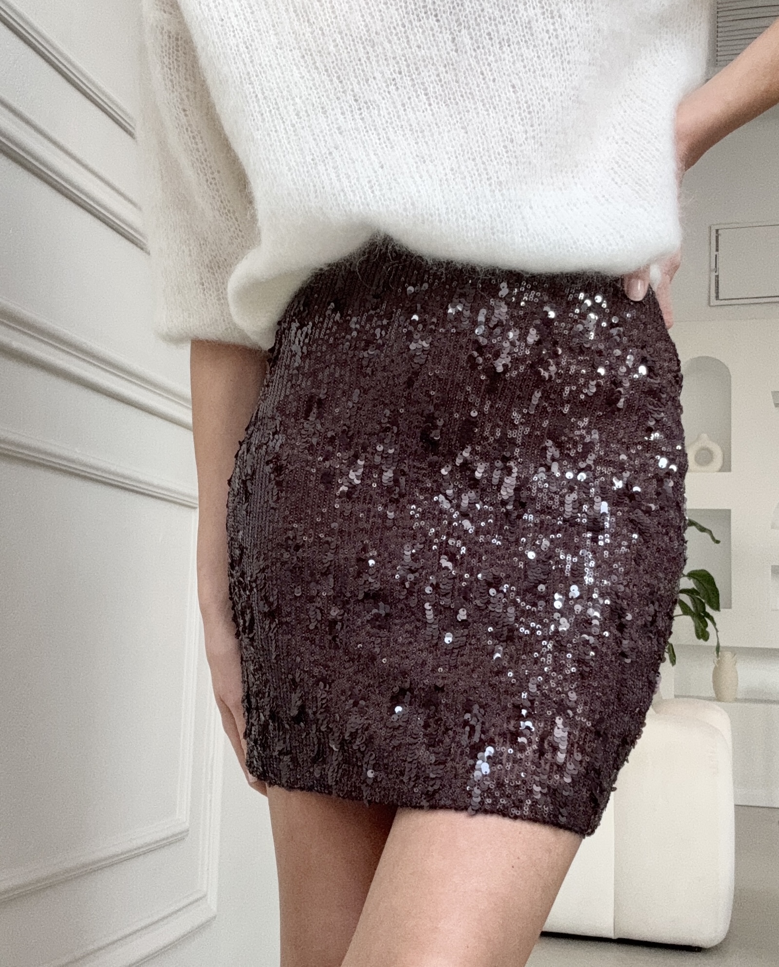 Elastyczna spódnica mini z cekinami. Dostępny kolor granatowy oraz brązowym.