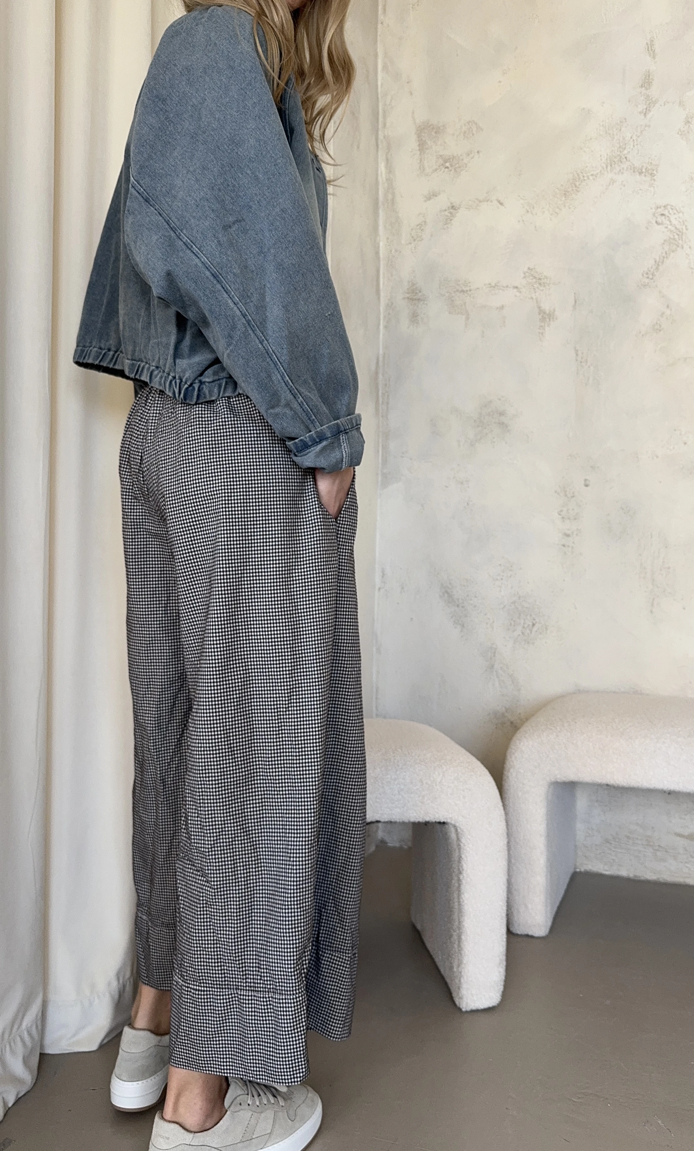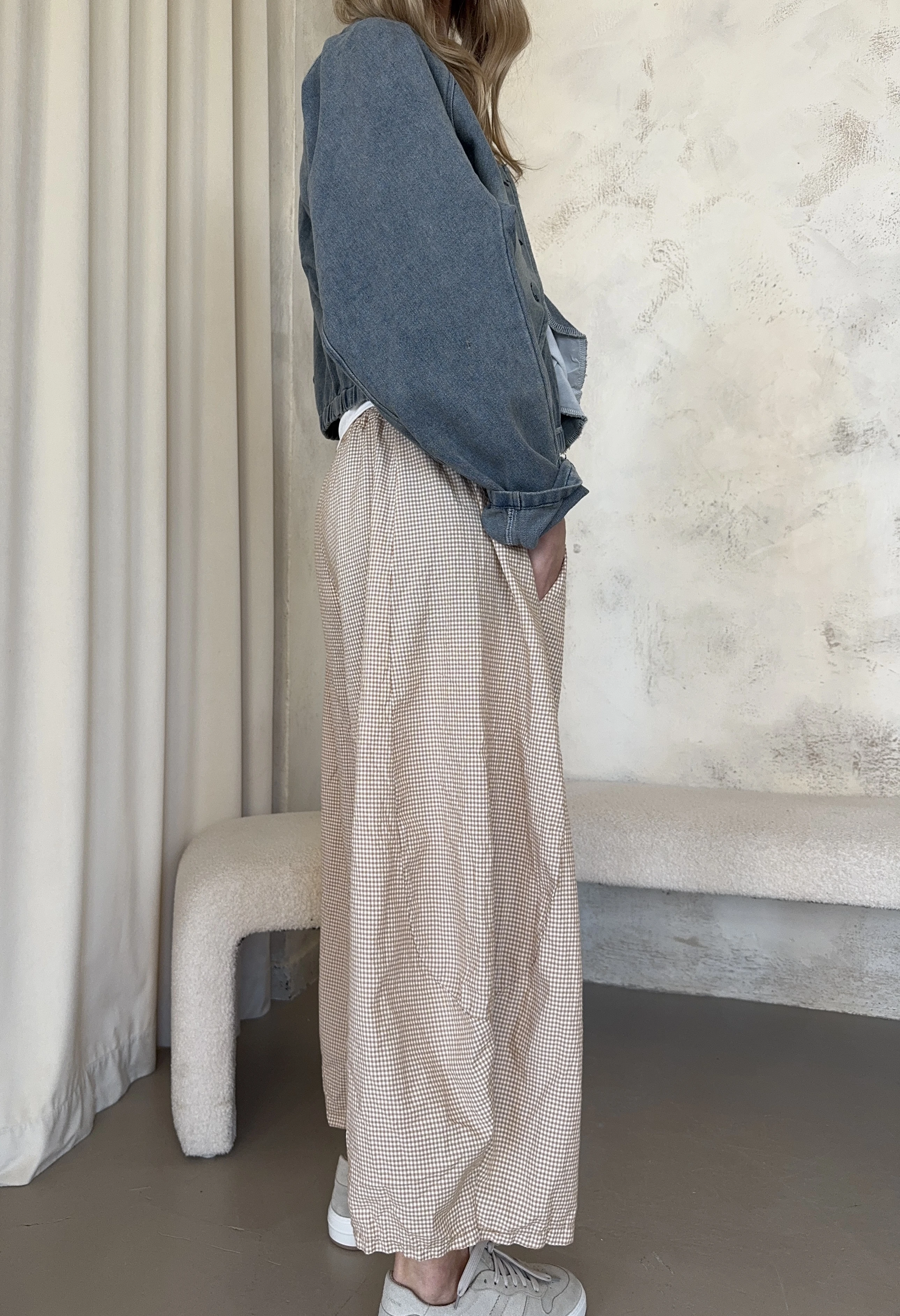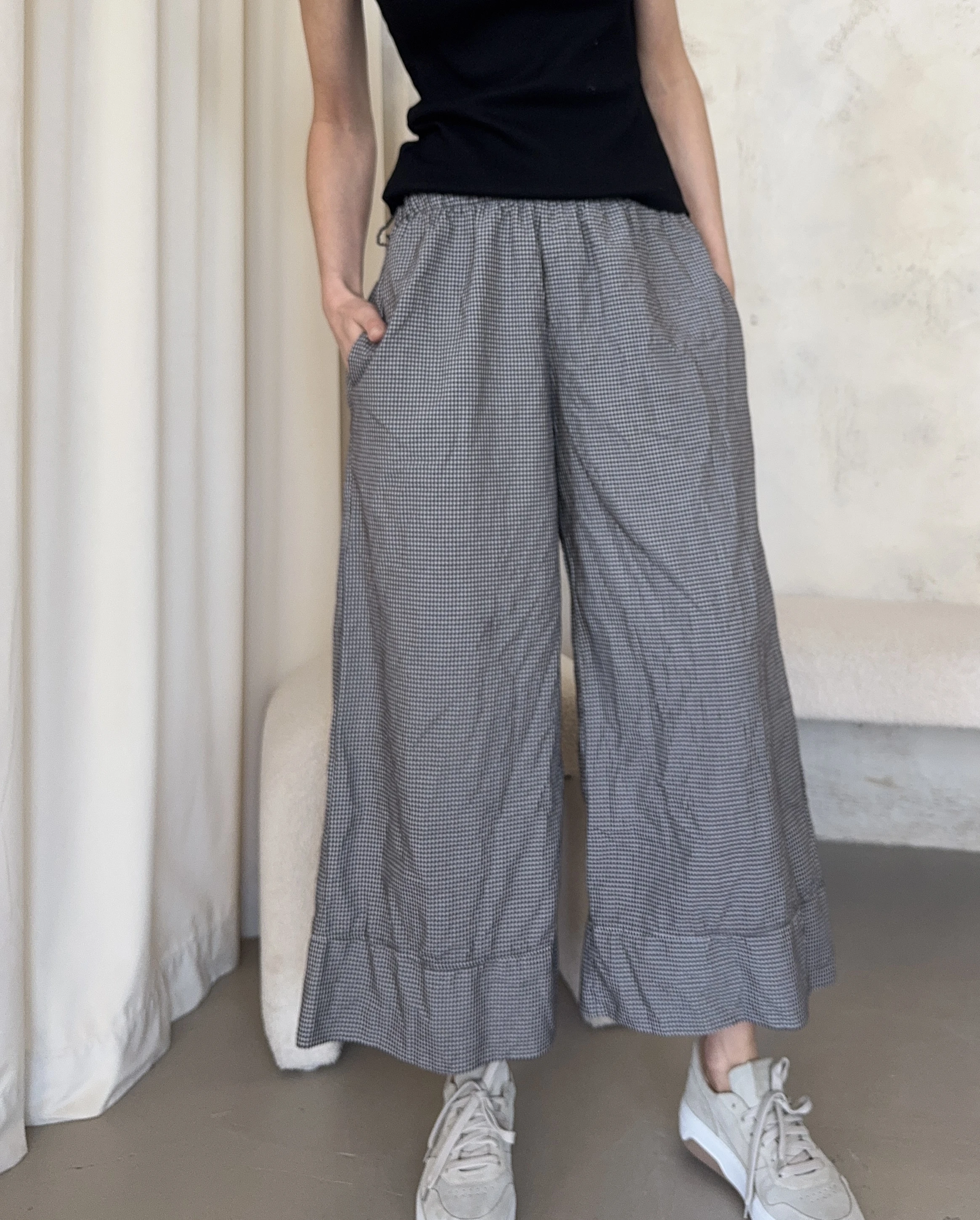 Bawełniane spodnie w drobną kratkę, szerokie, długość nogawki 7/8. Dostępne w kolorze beżowym i czarnym.