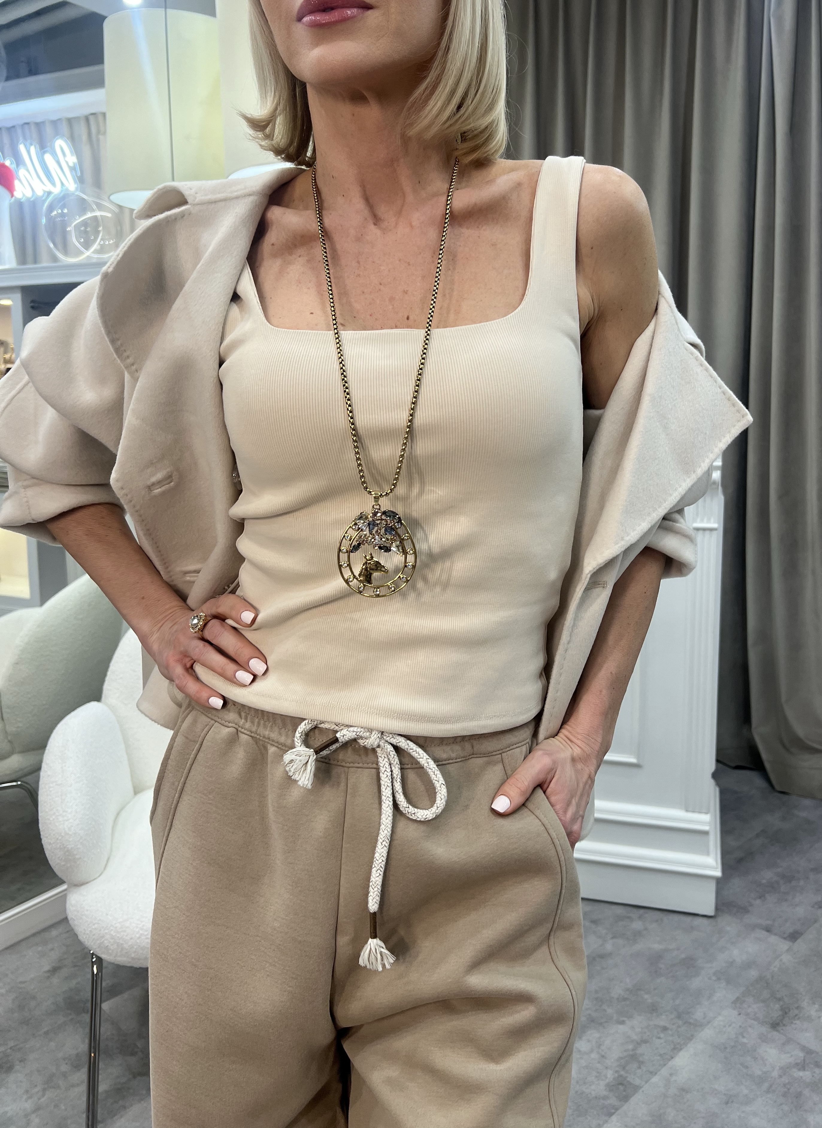 Krótki top w kolorze jasnego beżu, elastyczny.