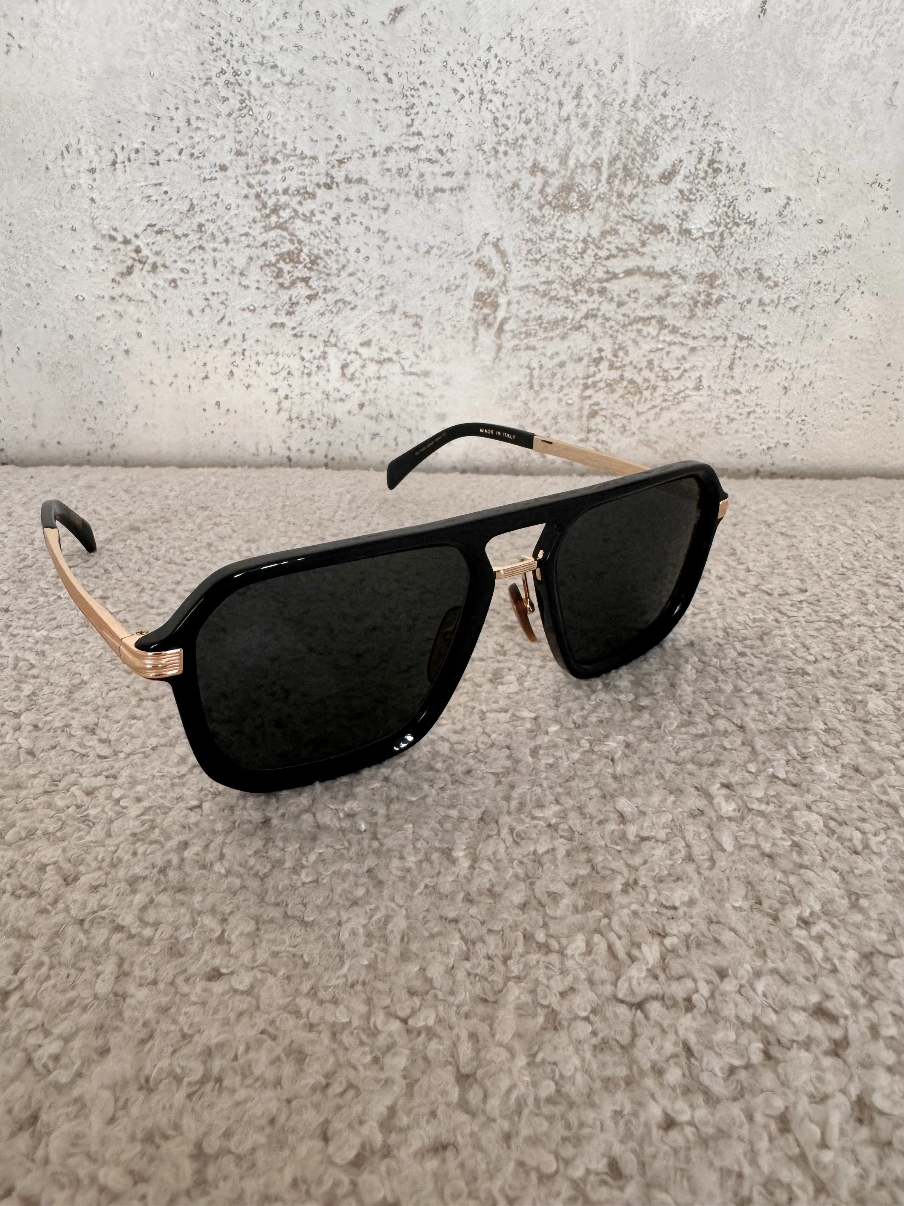 Czarne okulary ze złotymi metalowymi elementami.